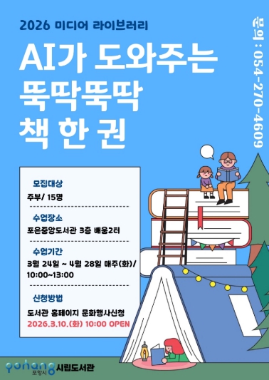 [파이낸셜경제=김지훈 기자] 포항시립포은중앙도서관은 오는 24일부터 4월 28일까지 매주 화요일, 포은중앙도서관 배움2터에서 ‘2026 상반기 별찌인문교실’과 ‘미디어라이브러리’ 수업을 운영한다.