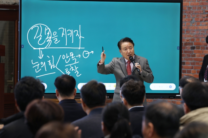 김 지사는 ‘길목을 지키자’라는 주제의 발언을 통해 “안목은 중요한 것을 가려내는 눈이고, 통찰은 본질을 꿰뚫는 힘”이라며, “민선8기 충북은 백두대간에 막히고 바다가 없다는 지리적 한계를 오히려 ‘대한민국의 길목’이라는 기회로 재해석해 왔다”고 서두를 뗐다.