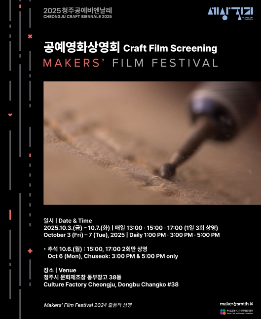 이번 상영회는 조직위와 한국공예·디자인문화진흥원이 협력한 전시연계 프로그램으로, 서호주 기반의 공예 전문 단체 ‘메이커 앤 스미스’가 주최하는 공예영화제 ‘메이커스 필름 페스티벌(Makers’ Film Festival)’의 2024년 출품작을 만날 수 있는 기회다.