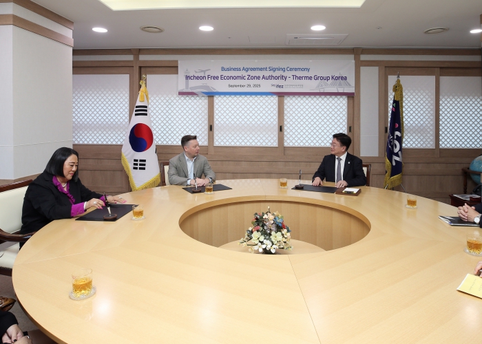 인천경제자유구역은 29일 오후 송도지타워에서 윤원석 인천경제자유구역청장,스텔리안 야콥(Stelian Iacob) 테르메그룹 부회장, 김인숙 테르메그룹코리아 대표 등이 참석한 가운데 ‘테르메 힐링&스파 리조트’ 사업 기본협약을 체결했다고 밝혔다.