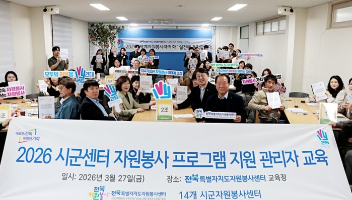 [파이낸셜경제=김예빈 기자] (사)전북특별자치도자원봉사센터(이사장 고영호)는 2026년 3월 27일전북도자원봉사센터 교육장에서 도내 14개 시․군 자원봉사센터 관리자 50여명이 참석한 가운데『2026 시군센터 자원봉사 프로그램 지원 관리자 교육』을 개최했다.