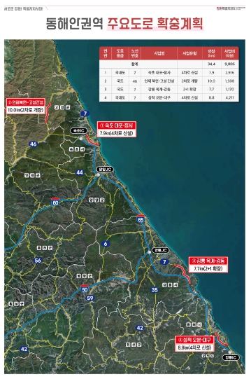 삼척 오분~대구(8.8km), 속초 대포~장사(7.9km), 강릉 옥계~강동(7.7km) 구간에는 노선우회 4차로를 신설하고, 일부구간은 3차로로 확장하는 한편, 진부령 위험구간 개량사업도 병행해 6차 국도·국지도 건설계획에 반영한다는 방침이다.