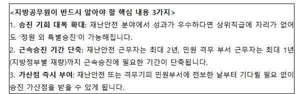근속 승진 기회도 단축된다. 특히 재난안전 분야에서 2년 이상 근무한 공무원의 경우, 현재 1년까지 단축 가능한 근속승진 기간을 최대 2년까지 단축할 수 있도록 의무화했다.