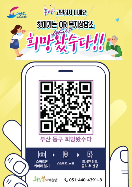 [파이낸셜경제=박영진 기자] 부산 동구는 복지 위기가구를 적극적으로 발굴하고 지원하기 위해, 이달부터 비대면 찾아가는 QR상담소 ‘희망왔수다’ 사업을 운영한다고 밝혔다. 특히 혹서기 기간 동안 집중적으로 추진할 예정이다.