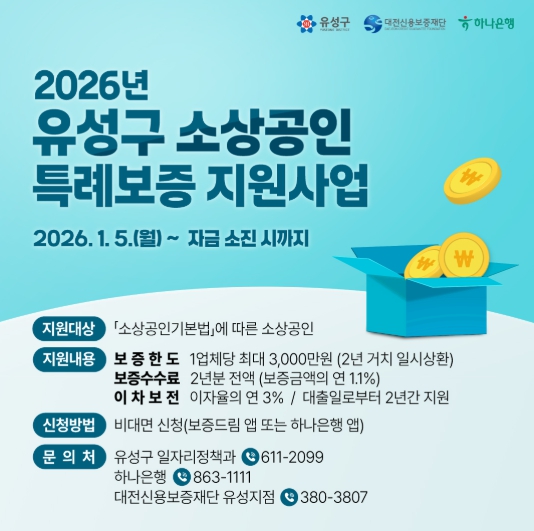 [파이낸셜경제=김영란 기자] 대전 유성구는 소상공인과 창업 기업의 금융 부담 완화를 위해 ‘2026년도 소상공인·창업 특례 보증 지원 사업’을 운영한다.
