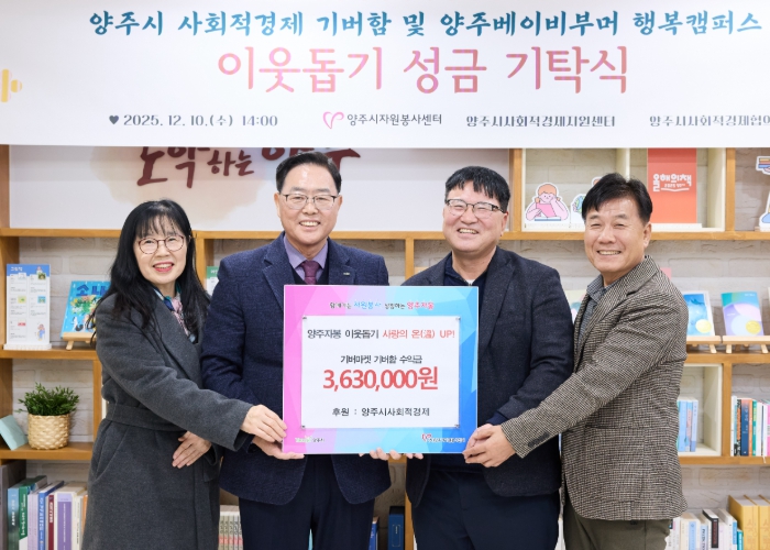 양주시 관계자는 “기부에 동참해 준 사회적경제기업과 시민 여러분께 감사드린다”며 “전달된 성금은 도움이 필요한 가정과 복지 사각지대 해소를 위해 사용될 예정”이라고 전했다.
