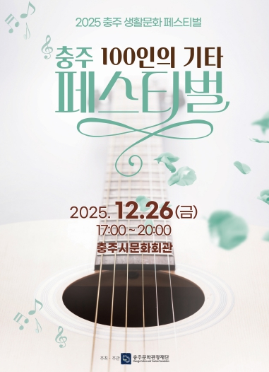 [파이낸셜경제=김기보 기자] (재)충주문화관광재단은 오는 12월 26일 충주시문화회관에서‘충주 100인의 기타 페스티벌’을 개최한다고 밝혔다. 이번 페스티벌은 충주 지역의 기타동아리들이 한자리에 모여 기타의 아름다운 선율을 시민들에게 선보이는 자리로, 통기타와 클래식기타를 모두 아우르는 공연 구성이 특징이다.