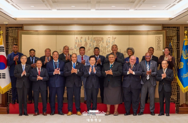 [파이낸셜경제=김예빈 기자] 이재명 대통령은 12월 10일 오전, 대통령실에서 제6차 한-태평양도서국 외교장관회의 참석을 위해 방한한 태평양도서국 외교장관 일행을 접견했다.