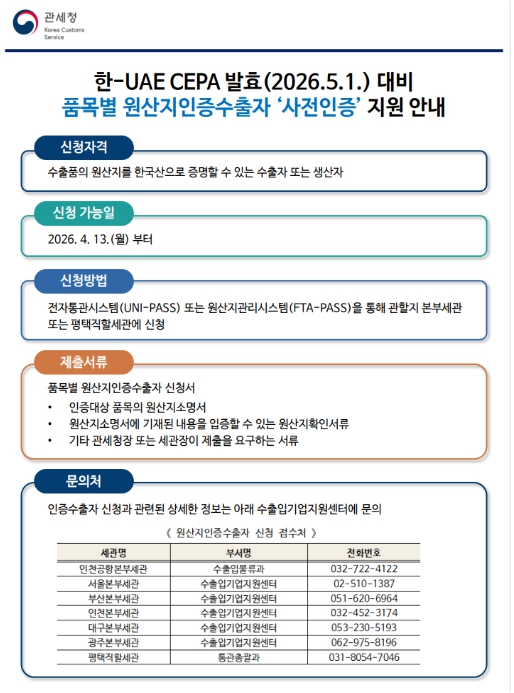 [파이낸셜경제=김예빈 기자] 관세청은 오는 5월 1일 발효되는'한-아랍에미리트연합국(UAE) 포괄적경제동반자협정(CEPA)'를 우리 수출기업들이 발효 첫날부터 즉시 활용할 수 있도록, 4월 13일부터 품목별 원산지인증수출자 ‘사전인증’ 신청·접수를 시작했다.