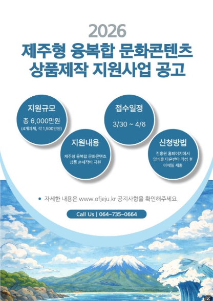 [파이낸셜경제=김영란 기자] 제주특별자치도와 (재)제주콘텐츠진흥원(원장:강민부)은 콘텐츠 IP 경쟁력을 기반으로 한 지속 가능한 상품화 모델 구축을 위해 2026 제주형 융복합 문화콘텐츠 상품제작 지원사업을 시행한다.